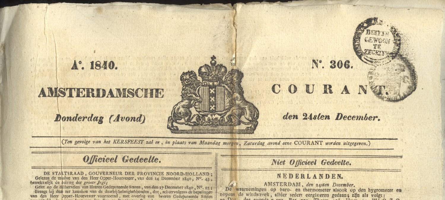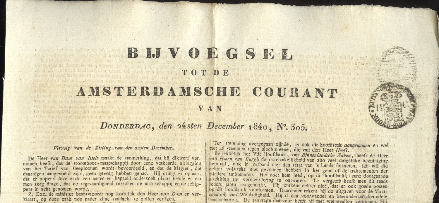 Amsterdamsche Courant 24 december 1840 met apart gestempeld bijvoegsel