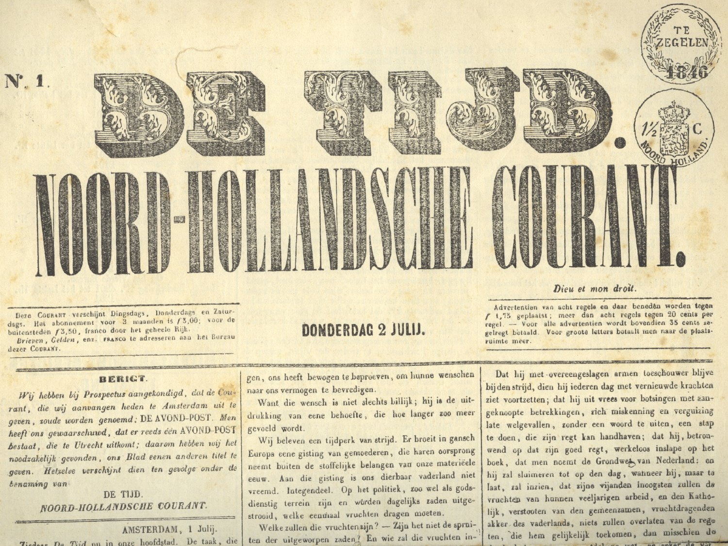 Zegels op De Tijd; klik op de afbeelding voor de titelpagina van het allereerste nummer na verhuizing van Noord-Brabant naar Amsterdam van De Tijd / Noord-Hollandsche Courant van 2 juli 1846.
