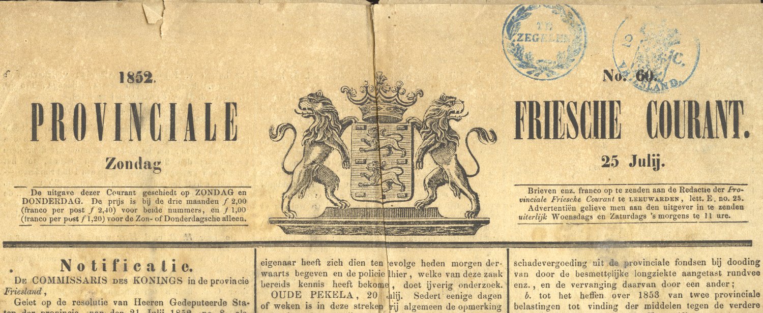 Elk blad kreeg twee zegels; klik op de afbeelding voor de titelpagina van deze Provinciale Friesche Courant van 25 juli 1852.